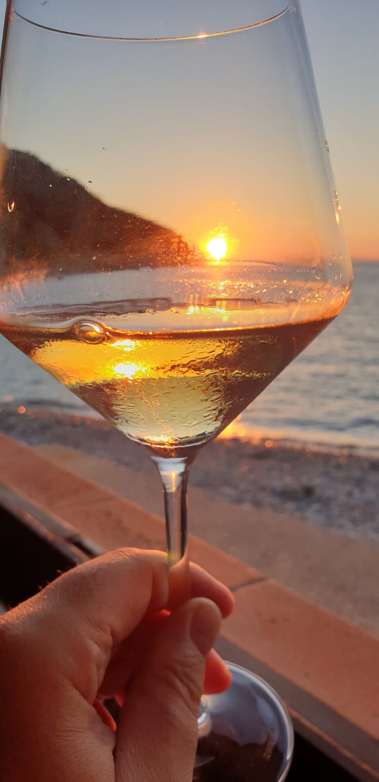 La cena è sublime come sempre, il servizio impeccabile. La Natura ci regala anche un tramonto che suscita stupore per la perfezione dei colori, per quel rosso che infiamma l’orizzonte tingendo il mare e le poche nuvole. Andrea ordina gli spaghetti al polpo “alla maniera di mamma Fillide”, antica ricetta di famiglia, segno di una cucina che cerca l’eccellenza senza però dimenticare il valore di quanto si è appreso tra i fornelli del focolare domestico.