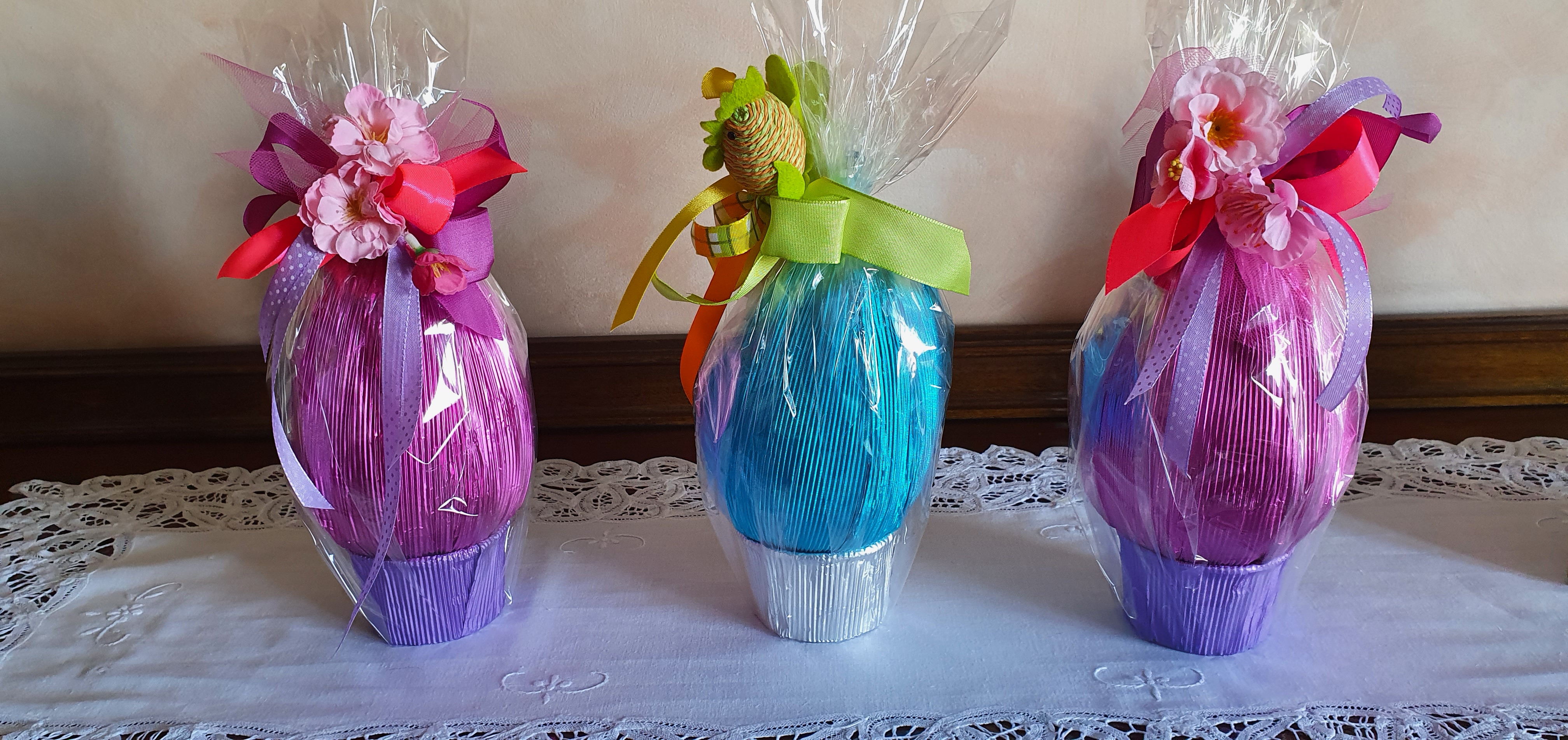 Come vi ho raccontato, è una torta che vanta infiniti tentativi, più o meno riusciti, di imitazione. Anch’io nel mio piccolo ogni tanto mi cimento nella sua realizzazione, in particolare dopo Pasqua, perché è un modo molto simpatico e goloso per utilizzare la cioccolata delle uova. Il bello di avere dei nipotini è anche quello di gustare le feste in un modo tutto particolare, perché grazie ai bambini tutto è più gioioso. Ho fatto preparare tre belle uova di Pasqua in una cioccolateria vicino a casa, dove nell’uovo mettono la sorpresa che porto io. In genere le uova confezionate dalle industrie alimentari contengono giochi abbastanza deludenti e poi sono spesso degli oggetti pericolosi per i più piccoli: Emma ha 16 mesi e mette tutto in bocca. Ecco qua nella foto le tre uova.