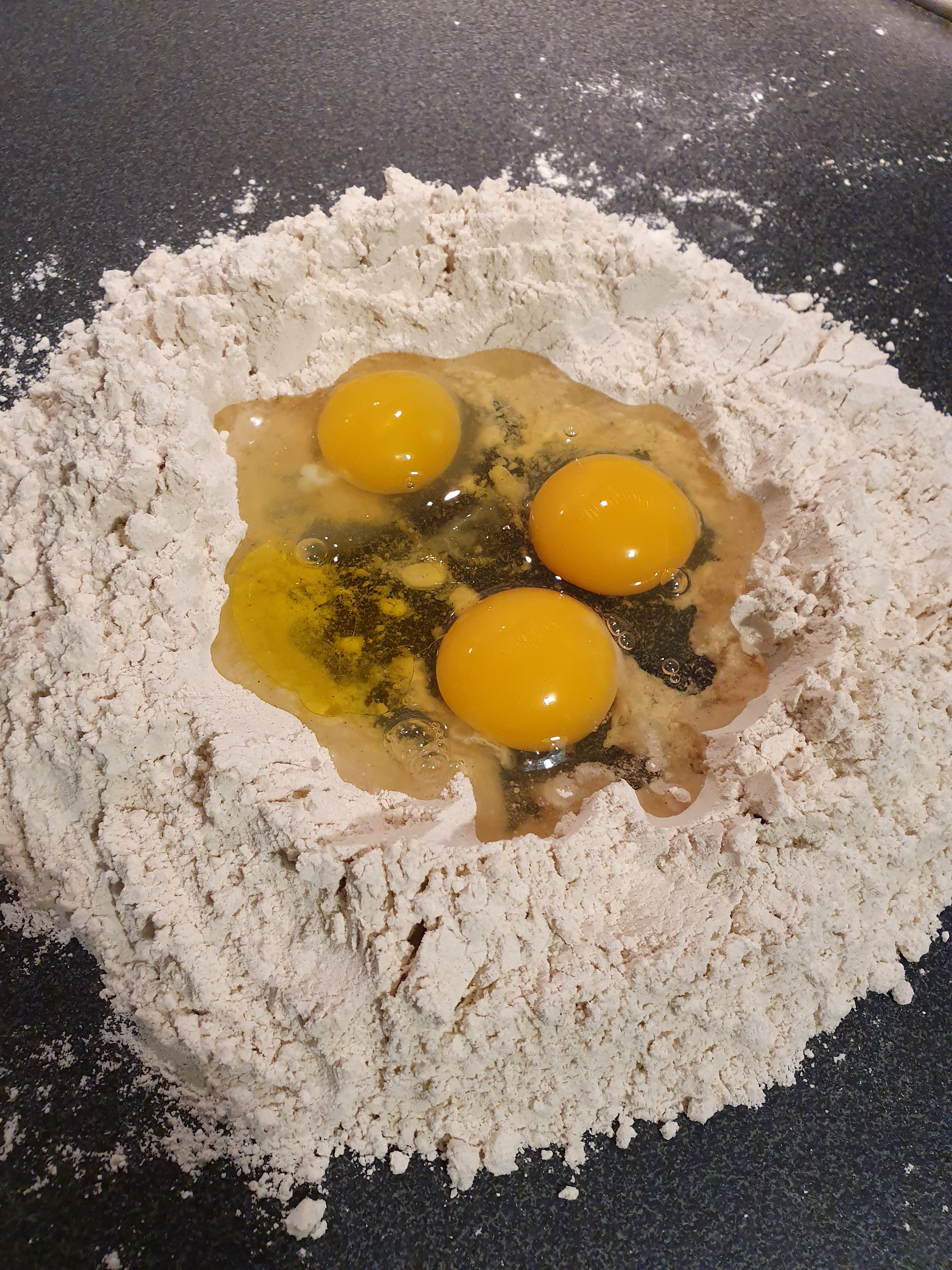 Innanzitutto abbiamo scelto di utilizzare i due tipi di farina, quella di grano tenero e quella di grano duro. Mi sono dedicata io all’impasto, disponendo la farina a cono e facendo al centro un cratere dove ho messo le uova; ho cominciato a sbatterle con la forchetta, aggiungendo a poco a poco la farina. Poi ho lavorato l’impasto con le mani, fino a renderlo omogeneo e elastico. E già a questo punto mi sono sentita una grande chef.