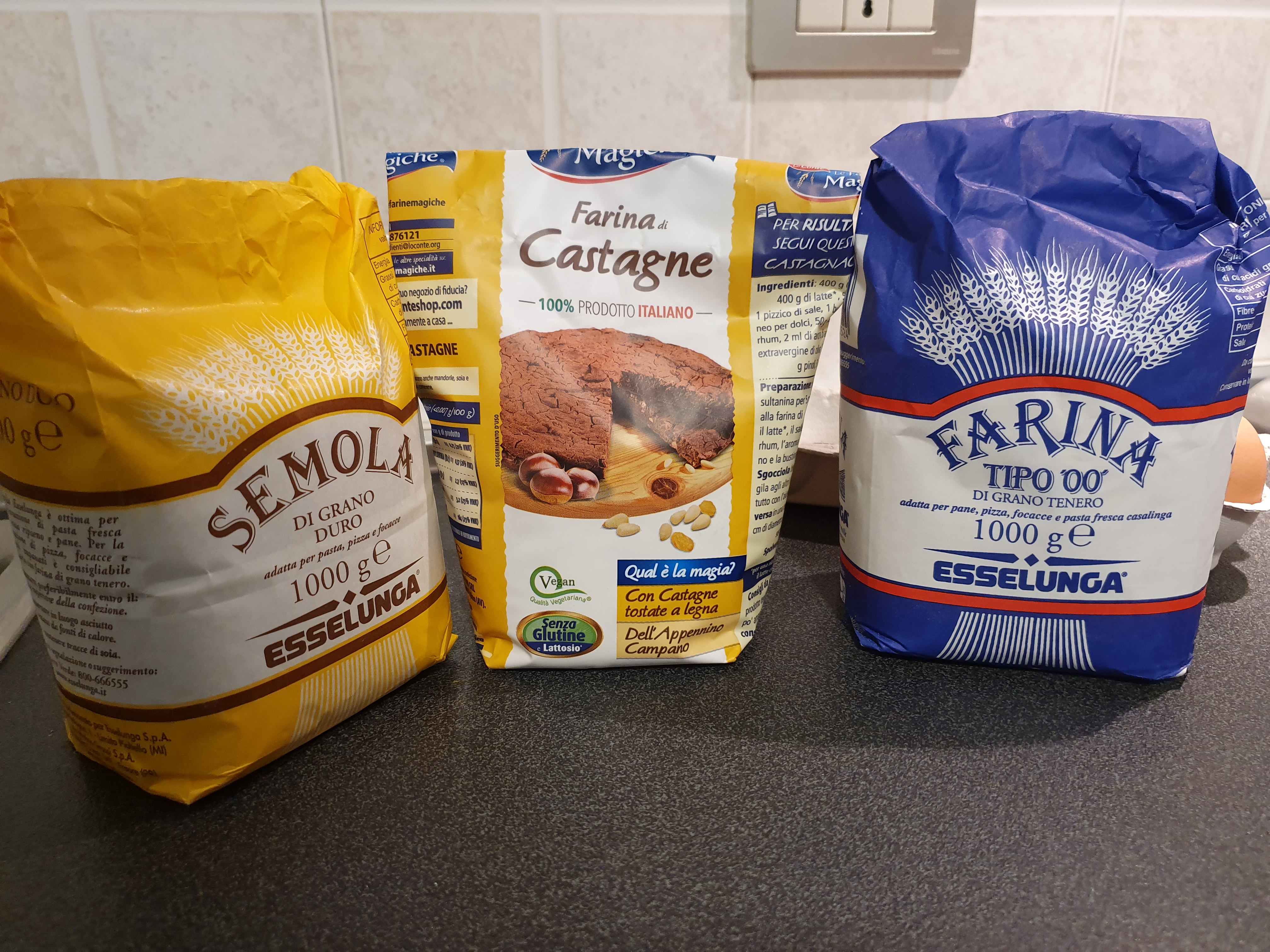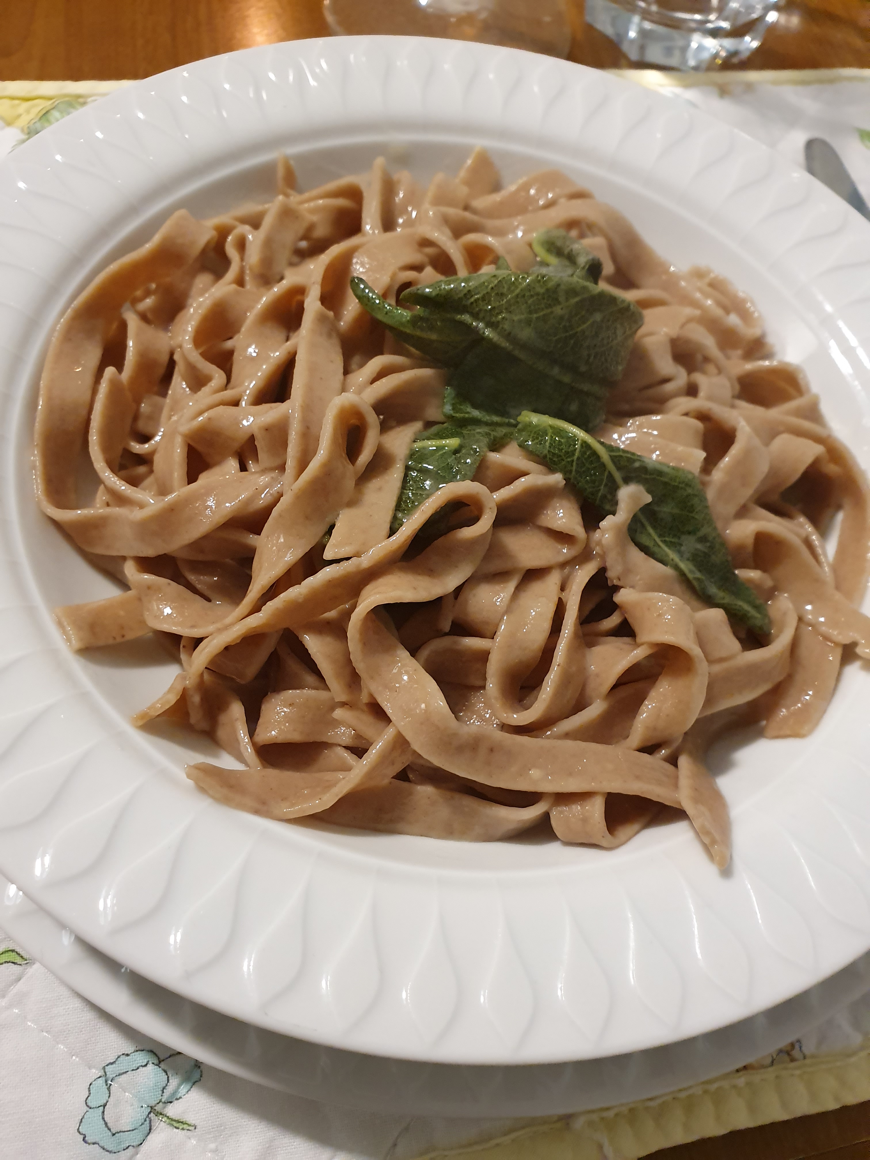 Sono venute proprio buone, già dalla prima volta che le abbiamo fatte! A poco a poco ci siamo perfezionati, nella lavorazione della pasta, nello spessore, nella lunghezza, e ci siamo a quel punto anche cimentati nella ricetta delle tagliatelle con la farina di castagne: col condimento di burro e salvia erano perfette. Le dosi? Per quattro persone, ho usato 150 gr. di farina di castagne, 75 gr. di farina di grano tenero e 75 g. di farina di grano duro, 3 uova.