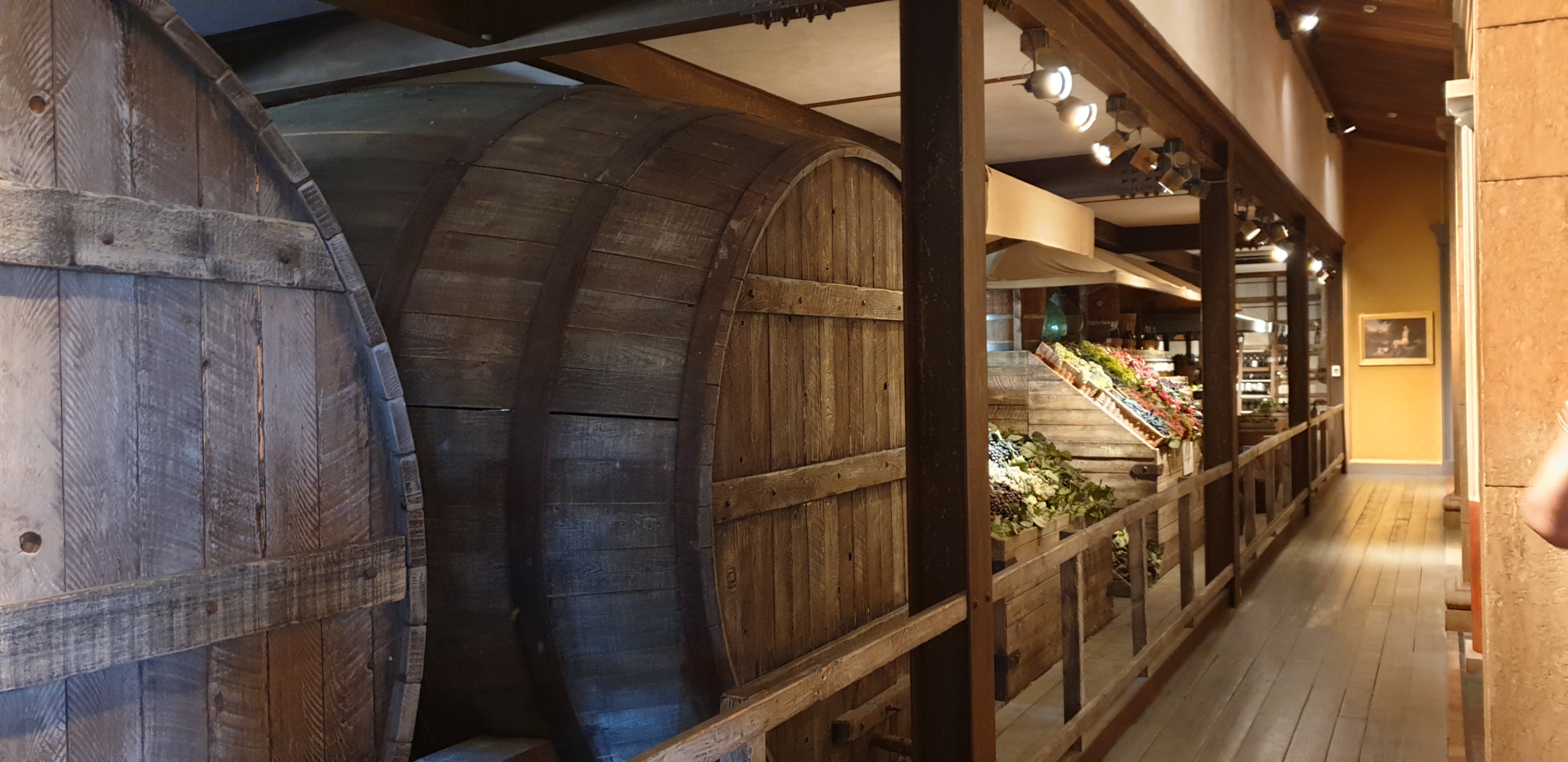 Le sale sono dominate dall’opera scenografica “Il mercato del vino” che Dante Ferretti, famoso scenografo di Hollywood (tra i molti premi che ha ricevuto ci sono anche tre Oscar), aveva realizzato per il Decumano di EXPO Milano 2015: un grande carro con una cascata di grappoli d’uva, bottiglie, fiaschi e botti.