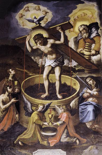 Tra le iconografie più singolari sparse nella nostra penisola vi è quella del torchio mistico: Cristo, schiacciato dalla croce come da un torchio, spremuto nella passione, offre alla Chiesa il sacrificio del suo sangue per la salvezza.