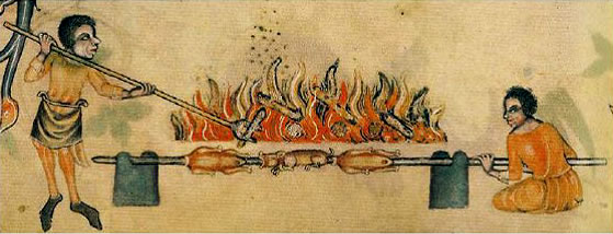 Tutta questa buona cultura gastronomica mediterranea viene messa a dura prova dalle invasioni barbariche: i popoli del Nord essendo nomadi sono meno dediti alla coltivazione della terra e inoltre hanno il mito della forza fisica che viene dimostrata anche dalla capacità di mangiate colossali soprattutto di carne. Nel Medioevo i banchetti nei castelli vedono trionfi di spiedi, arrosti e cacciagione, mentre nelle abbazie i monaci raccomandano astinenza e digiuni.