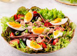 Ma concentriamoci adesso sul concetto di insalata, col quale oggi ci si riferisce a piatti che non contengono solo verdure ma anche carne, pesce, uova, formaggi e cereali. Soprattutto in estate, ma non solo, vanno per la maggiore queste grandi ciotole ripiene di ogni ben di Dio: l’insalata smette di essere solo un contorno e diventa un pratico e gustoso piatto unico. Ecco le insalate di mare dove le verdure sono mescolate a crostacei e molluschi; quelle con dadini di prosciutto o di pancetta croccante; con patate e tonno, uova sode e formaggio; le insalate di pollo o di petto d’anatra. C’è chi per realizzare quella croccantezza così raccomandata dai grandi chef aggiunge fettine di mela o gherigli di noci: alla diversa consistenza si accompagna così anche un contrasto tra il sapore dolce e quello più salato e acido. Non dimentichiamo le insalate di riso, di pasta, di farro, delle quali esistono innumerevoli versioni e che si chiamano insalate ma spesso le verdure hanno nel mix un ruolo molto marginale.