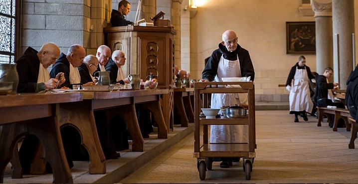 Ecco il refettorio dell’Abbazia di Solesmes, famosa per avere sempre coltivato la tradizione del canto gregoriano. Nell’immagine vedete bene il gradino sul quale sono posti i fratini di legno, consentendo così al monaco che serve a tavola di non doversi chinare nel porgere i piatti e i vassoi: non solo bellezza ma anche praticità e funzionalità. Le grosse colonne e il pulpito dal quale un monaco legge un testo spirituale trasmettono un’immagine di sacralità al luogo e al rito del pasto consumato tutti insieme.
