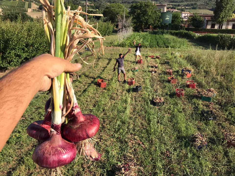 Riconosciuta come semente autoctona della Regione Marche, è coltivata gelosamente dai contadini che hanno sempre creduto in questo prodotto e hanno mantenuto la tradizione della sua coltivazione, consapevoli della grande qualità. Come i coltivatori della microfattoria rASOterra (un piccolo gioco di parole, siamo nella valle del fiume Aso), un’azienda di famiglia che propone un’agricoltura sana e naturale, con l’obiettivo dell’autoconsumo e della vendita diretta alle famiglie e ad alcuni ristoranti e supermercati di Pedaso. Bando alla globalizzazione degli alimenti, all’industrializzazione dei prodotti: qua siamo davvero a chilometro zero! C’è voglia di tradizione ma anche di innovazione: sono coltivatori che, una volta scoperta la qualità della cipolla piatta di Pedaso, danno subito il via alla produzione, si impegnano per il riconoscimento del presidio Slow Food e ricevono l’onere (e l’onore) di essere contadini custodi! Espressione affascinante, ma cosa vuol dire? Il contadino custode è, come recita una Legge Regionale, il “soggetto pubblico o privato che a qualunque titolo provvede alla conservazione delle risorse genetiche a rischio di estinzione iscritte nel Repertorio regionale”. Che meraviglia, quanta passione e attenzione al territorio. Alla base di tutto c’è una grande cultura del lavoro, con una sana antropologia che parte dalle radici, e non solo da quelle degli ortaggi: nella pagina facebook della microfattoria rASOterra leggo parole molto belle sulla loro mission, in particolare quando definiscono la famiglia: «importante modello sociale capace di agire e costruire un nuovo pensiero a sostegno della vita e del futuro». Che parole profonde e piene di verità.