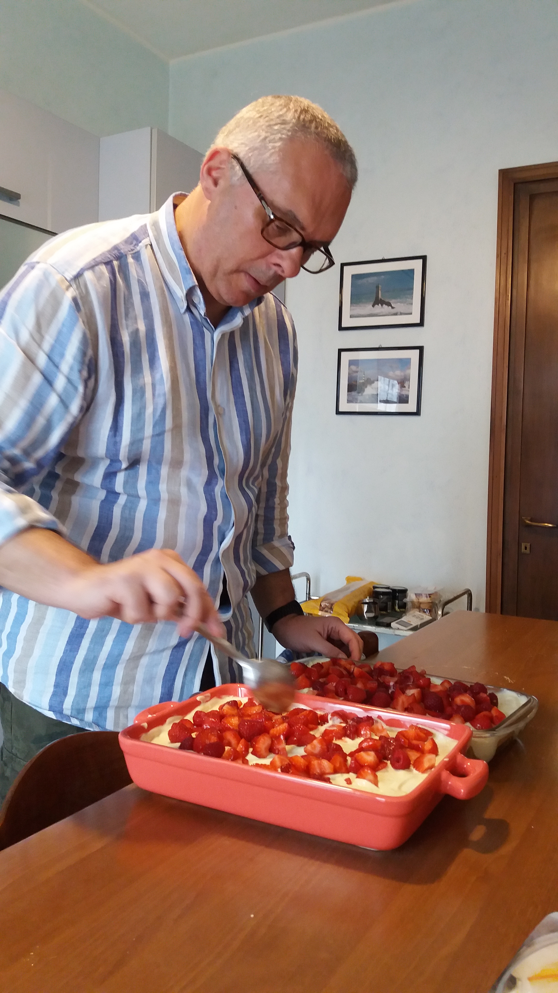 Questo post, e la ricetta che vi presenterò, prende spunto da un paio di foto che ho pubblicato su un social network. Mio marito Andrea stava realizzando il Tiramisu alle fragole e mentre lo guardavo ammiravo la sua concentrazione nell’impresa e anche la sua classe impeccabile: realizzava il dolce indossando una bella camicia di lino acquistata a Sorrento.