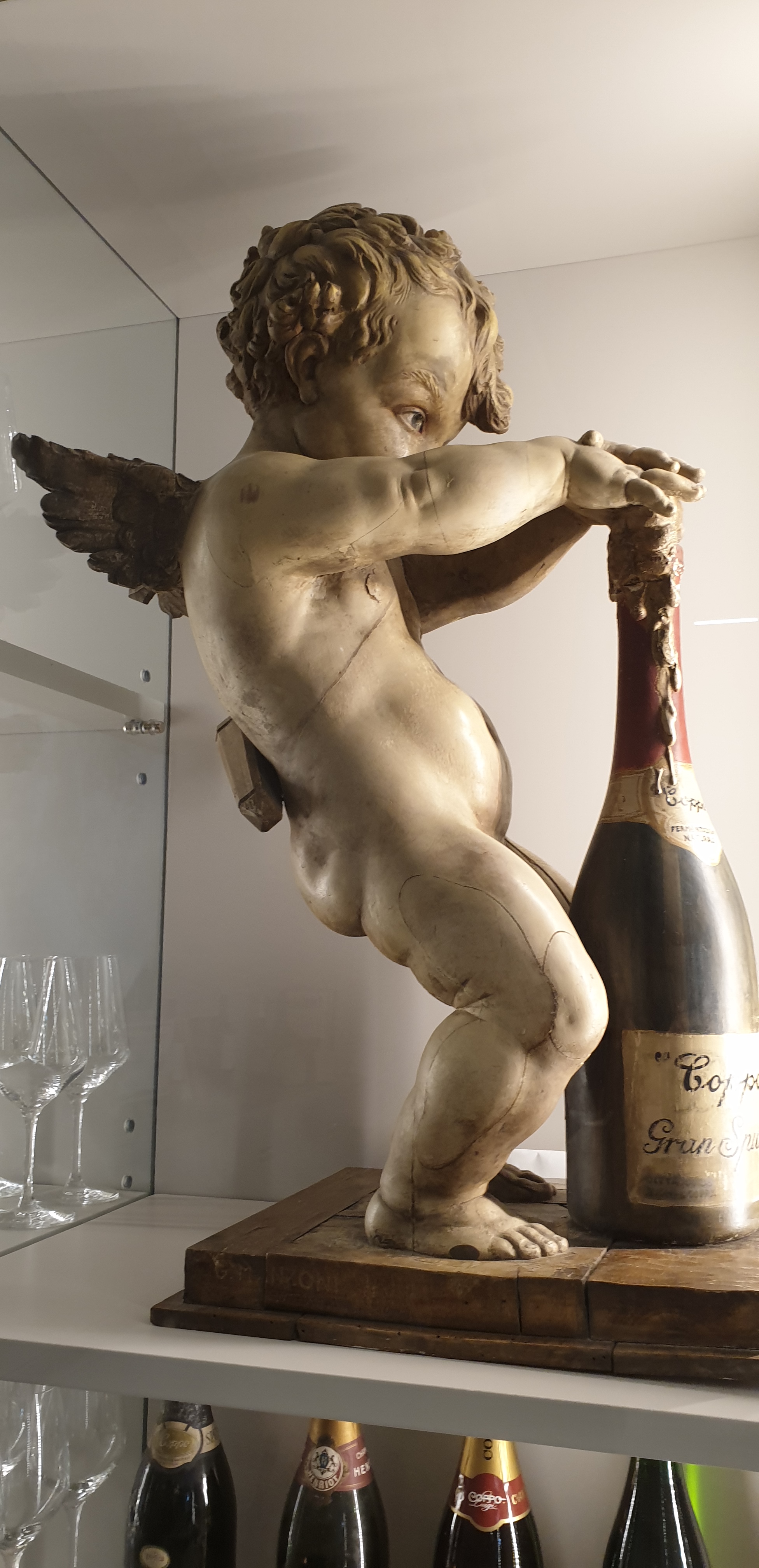 Dopo la visita alle cantine sotterranee veniamo accompagnati nella sala degustazione, dove troneggia il simbolo delle Cantine Coppo: un putto alato, con faretra e frecce, simbolo di amore e passione, che afferra una bottiglia di spumante dal quale si sprigiona l’effervescenza. Piero Coppo, fondatore dell’azienda, teneva molto anche alla scelta del logo e negli anni Venti del Novecento commissionò ad un giovane scultore di Bergamo, Giacomo Manzoni, un’immagine per le sue bottiglie. Una piccola opera d’arte, ancor più pregevole considerando che quello scultore sarebbe poi diventato una vera celebrità, con il nome d’arte di Manzù.