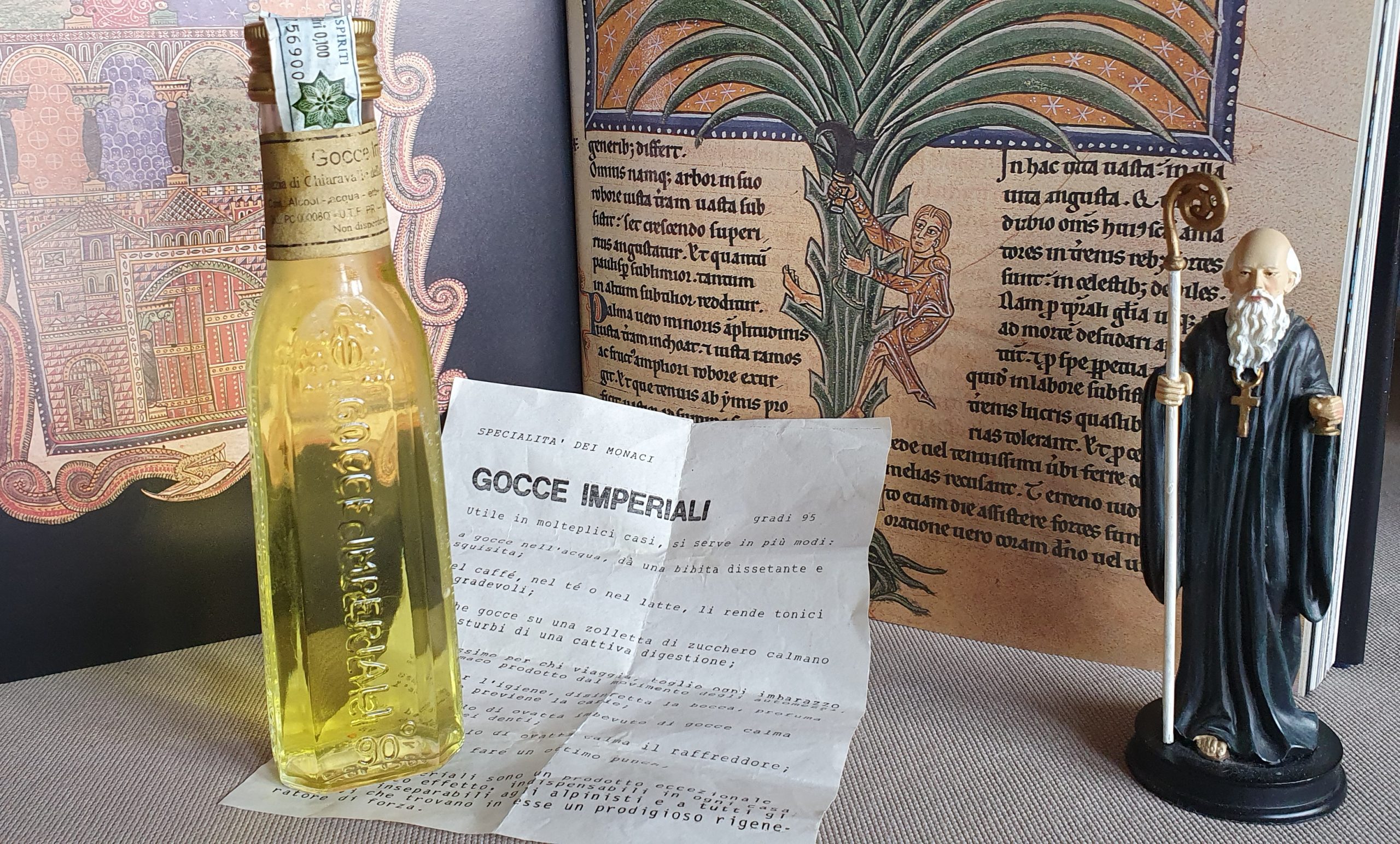 Mio padre prende da un armadio che custodisce vini e liquori una bottiglietta dall’aspetto prezioso e me la regala. «Tu che parli spesso di monachesimo nel tuo blog, ecco materia per il prossimo articolo». Sono le storiche Gocce Imperiali del Monastero di Chiaravalle della Colomba, in provincia di Piacenza. Sul vetro, in rilevo, c’è la scritta “Digestive, aromatiche, dissetanti” e il prodotto è accompagnato da un foglietto che ne esalta le qualità: «Le Gocce Imperiali sono un prodotto eccezionale dal benefico effetto, indispensabili in ogni casa, compagne inseparabili degli alpinisti e a tutti gli sportivi, che trovano in esse un prodigioso rigeneratore di forza. Utile in molteplici casi, si serve in più modi».