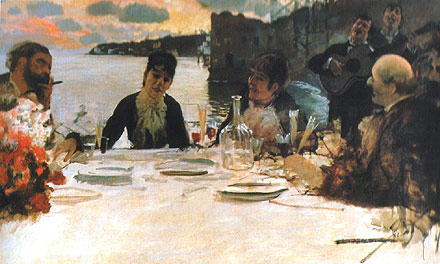Per concludere, poiché la tavola e la cucina sono anche un’ispirazione per gli artisti, vi mostro due quadri che illustrano bene quanto vi ho raccontato. Giuseppe De Nittis dipinge questo “Pranzo a Posillipo” (1879): un gruppo di commensali è riunito intorno ad un grande tavolo coperto da una tovaglia bianca, sulla quale sono distribuite le stoviglie e una grande composizione floreale. Gli avventori conversano amabilmente in attesa del pranzo. Dietro di loro alcuni musicisti imbracciano le chitarre e cantano. Sullo sfondo, il golfo di Napoli. Che atmosfera di pace e bellezza!