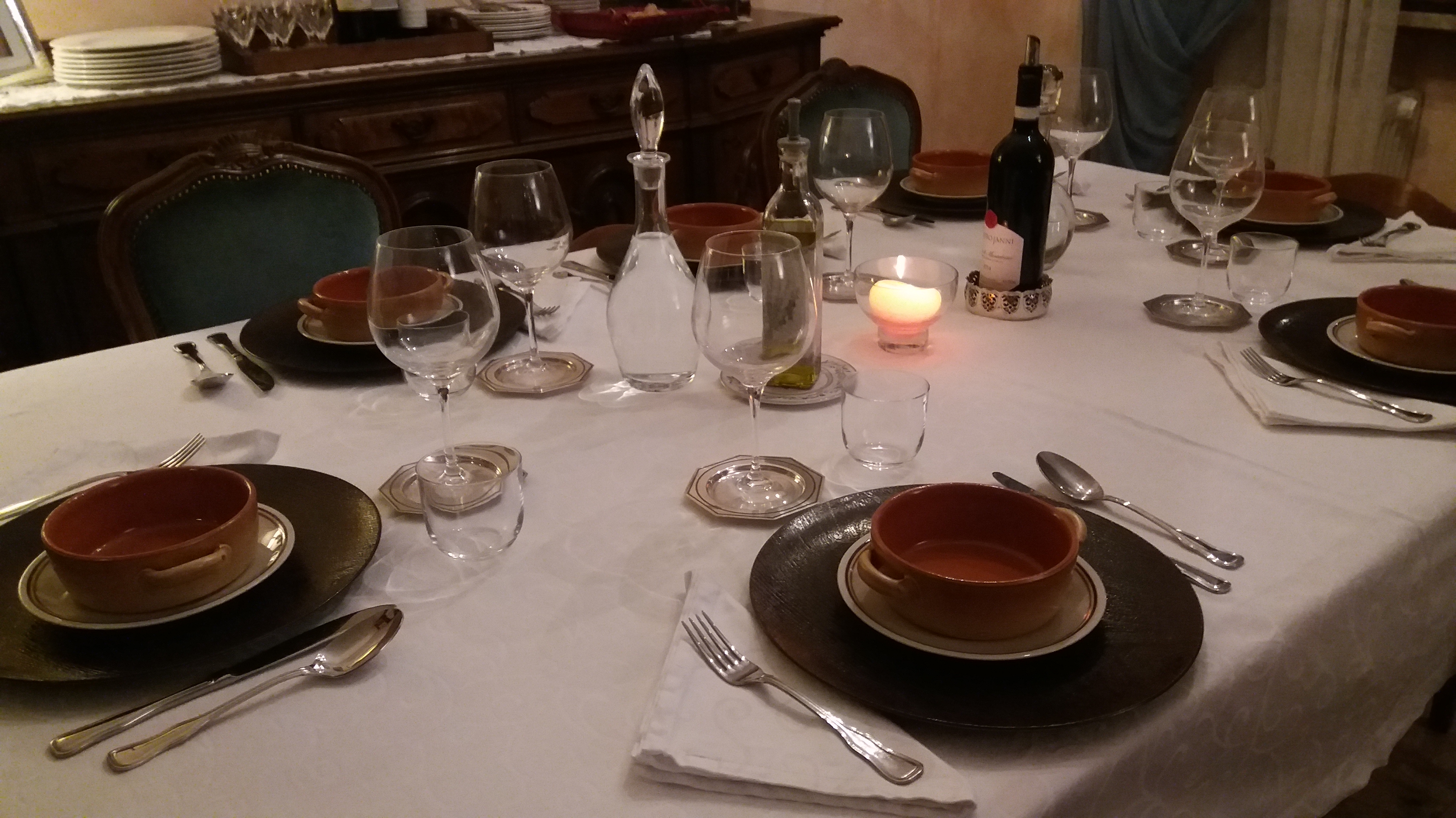 W la Ribollita, con i suoi gustosi fagioli, il sapore deciso del cavolo nero, il pane toscano senza sale un po’ raffermo che, quando ha assorbito il brodo della minestra, si fonde in un tutt’uno con gli altri ingredienti e il risultato è una pietanza cremosa e morbida. Da cucinare nella pentola di coccio, servire nelle graziose ciotole, con un filo d’olio, naturalmente toscano, il tutto annaffiato da vini del territorio (ecco nell’immagine la mia tavola apparecchiata).