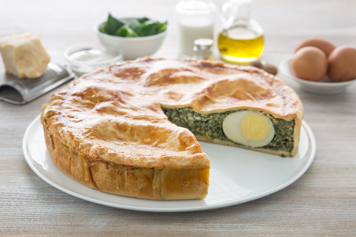 Se ci spostiamo a Genova, troviamo la torta pasqualina, con il ripieno di bietole, che a primavera germogliano, e uova, che come vedete ricorrono sempre nelle preparazioni pasquali. Secondo la tradizione i fogli di pasta sfoglia devono essere 33, come gli anni di Gesù.